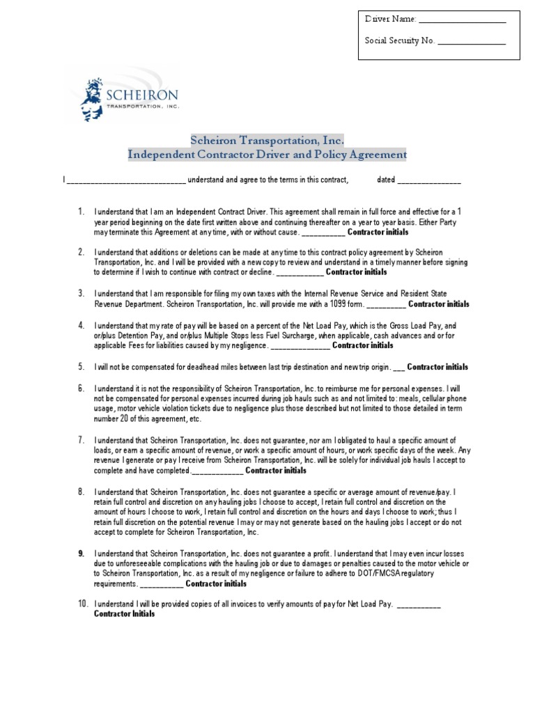That I am waiving benefits under the Act unless I have a written or oral agreement to work as an employee for that hiring agent. initial I understand and agree that I am responsible for all taxes related to my work as an independent contractor. initial ... Doc Retrieval